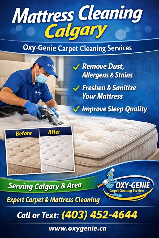 Looking for professional mattress cleaning in Calgary? Oxy-Genie Carpet Cleaning Services provides reliable mattress cleaning for homeowners who want a cleaner, fresher sleeping surface and a more comfortable home environment. Over time, mattresses can collect dust, body oils, everyday soil, and light staining that regular household cleaning may not fully remove. A professional cleaning helps freshen the fabric and improve the overall appearance of the mattress.